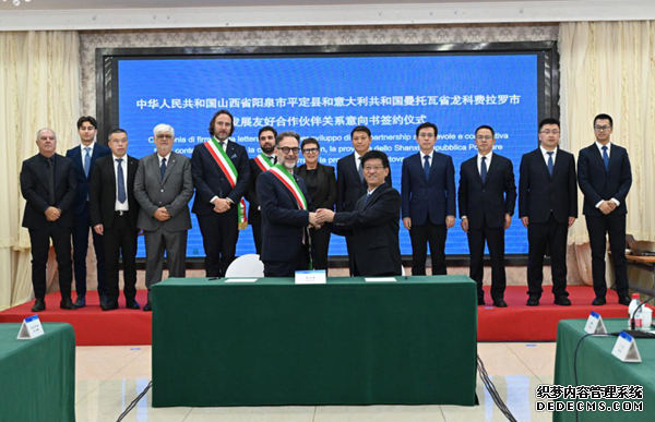 座谈会上,平定县与意大利共和国曼托瓦省龙科费拉罗市分别介绍两地情况,双方签署发展友好合作伙伴关系意向书。